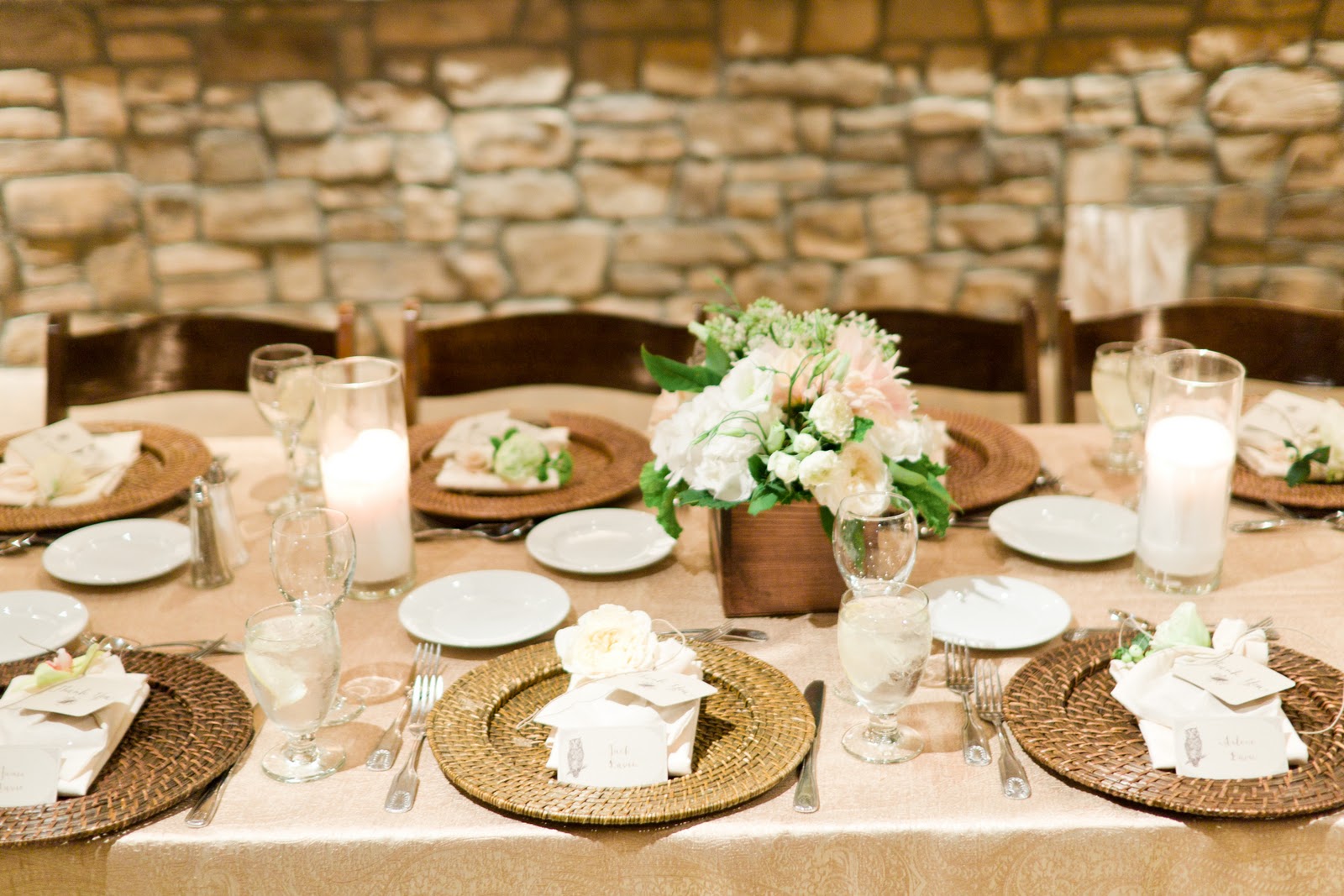 Beth filled the room and tablescape with candle to create a feeling of warmth and intimacy. The charming blush color of the florals mixed with ivory, champagne linens and rattan chargers finished the look.